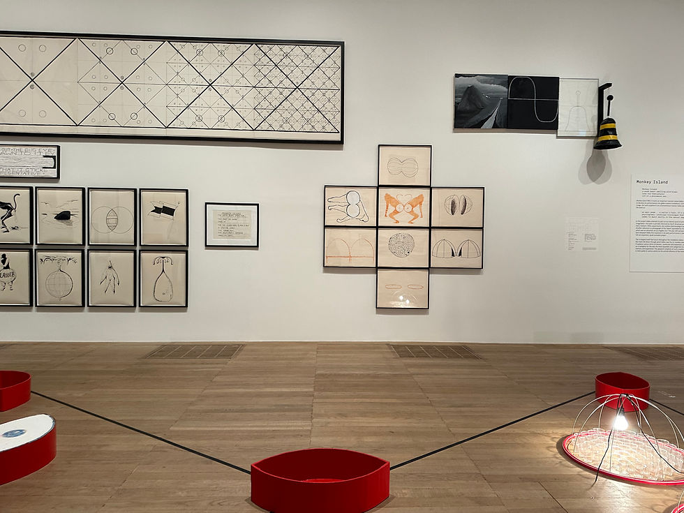 Throughout his career Mike Kelley seems to have a consistent focus on space as a starting point for psychological exploration. This is clear in his early work "The Solipsistic Landscape" (1982), and runs through his work "Monkey Island" (1982) where he takes his viewpoint of the Island - through the links on a fence - as a jumping-off point to explore not just the view of the island itself but all that the island metaphysically contains, as well.